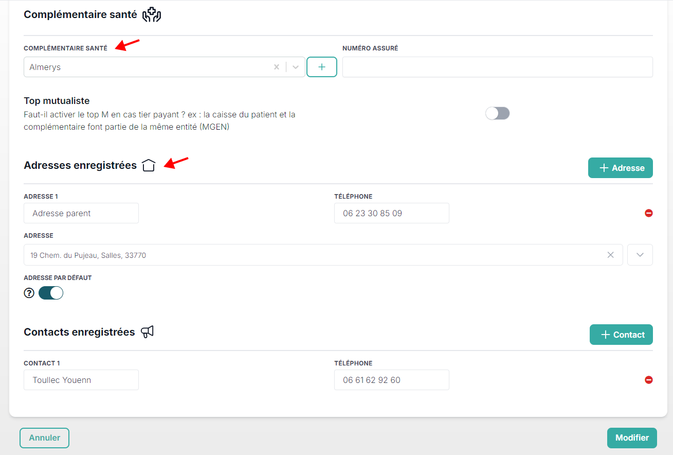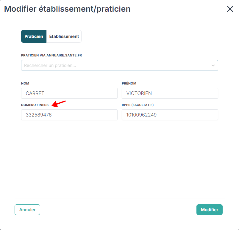 Pour ajouter le numéro FINESS du praticien puis sur modifier.